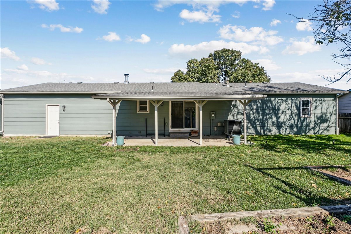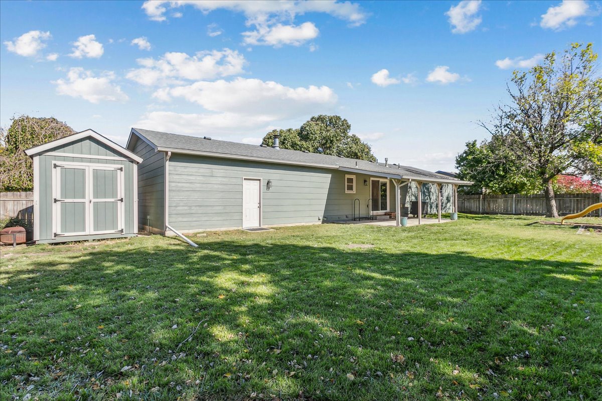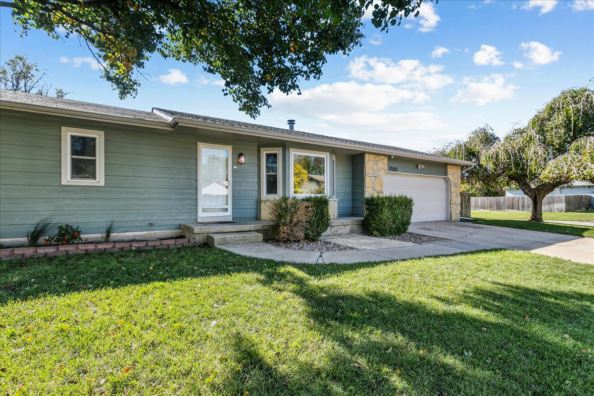 Welcome home to this well-maintained ranch located in the desirable Goddard School District! This move-in ready property offers plenty of space for the whole family, with a total of 4 bedrooms, 3 full bathrooms, plus an additional bonus room in the finished basement — perfect for a home office or guest space. This home features an inviting layout, cool color pallet, and spacious living area as you enter the home. The kitchen and dining area flow seamlessly together and there is access from this room to the large covered patio. The primary suite offers a private retreat with its own full bath, while the finished basement adds valuable living space for movie nights, hobbies, or hosting friends. Situated on a corner lot, this oversized fully fenced yard has plenty of space for the kids and a storage shed that stays with the property! This family friendly neighborhood allows easy access to schools, parks, and shopping. Contact us today to arrange for a showing!