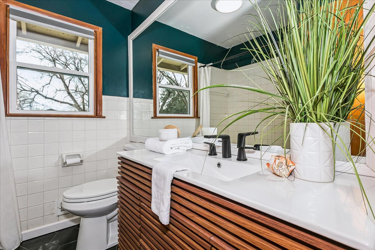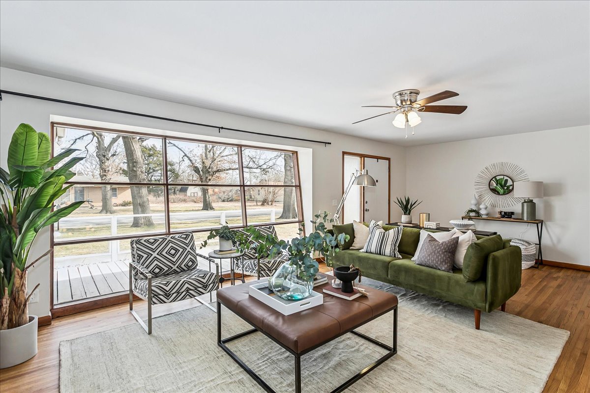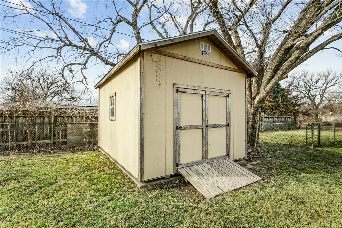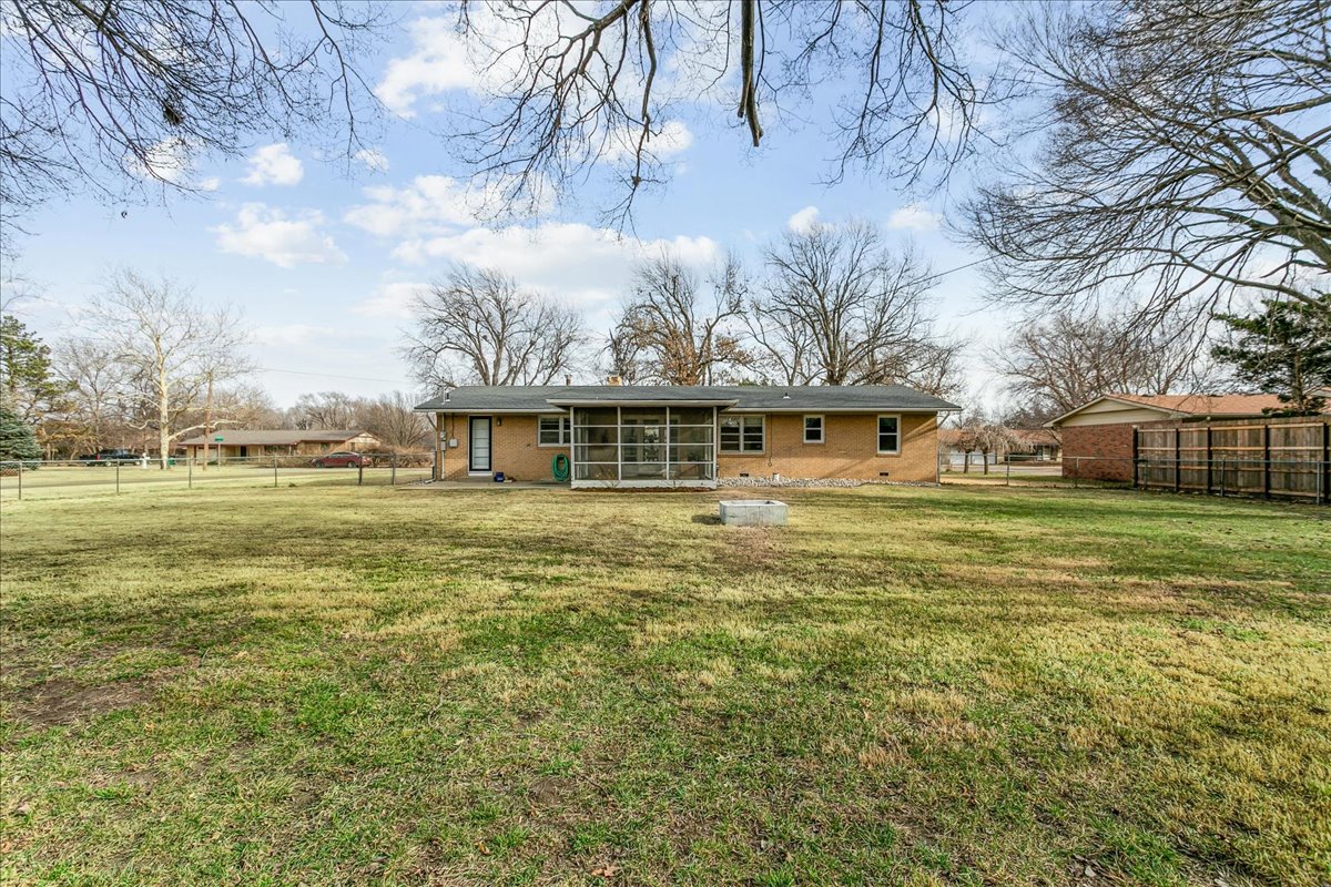If you love Mid Century Modern, you’ll love this home! Welcome to the perfect blend of old and new with this three bedroom, two-bath home located on nearly a half acre corner lot in North Wichita! Step inside to a bright living room featuring a large picture window that fills the space with natural light, a wood-burning fireplace and beautifully refinished hardwood floors. Just beyond the living area you will step into the formal dining room with a moody vibe and modern light fixture. The kitchen offers newer luxury tile flooring, quartz countertops, an oversized sink, and stainless steel appliances. Off the kitchen, you’ll find a spacious full bathroom with waterproof LVP and laundry hookups with a door leading to the back patio. The opposite side of the home features three comfortable bedrooms (some with new windows) and a full hall bath with a new mid mod vanity. A door off the dining room leads to a cozy screened-in patio that opens to the spacious fenced backyard complete with mature trees, a large storage shed, concrete fire pit, irrigation well and sprinkler system. There is plenty of room to add a shop and/or detached garage with direct access from the adjoining street. Conveniently located on a quiet dead end street near shopping, dining, and I-235 for quick access to everything Wichita has to offer. THIS HOME IS MOVE-IN READY!